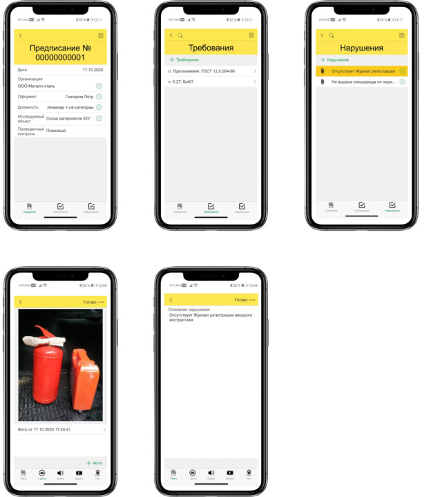 К каждому выявленному нарушению возможно добавление фото-, аудио-, видеоинформации, подтверждающей факт нарушения требований.