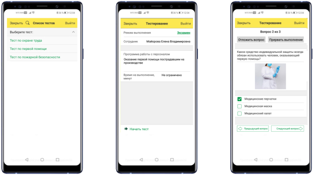 Возможность прохождения сотрудником проверки знаний с помощью мобильного приложения «Тестирование» по любой из областей знаний, например: Охрана труда, промышленная безопасность, пожарная безопасность и друнних по разным программам обучения. Тесты сотруднику, по которым он должен пройти проверку знаний, назначаются в основной базе ответственным сотрудником, например специалистом по охране труда.