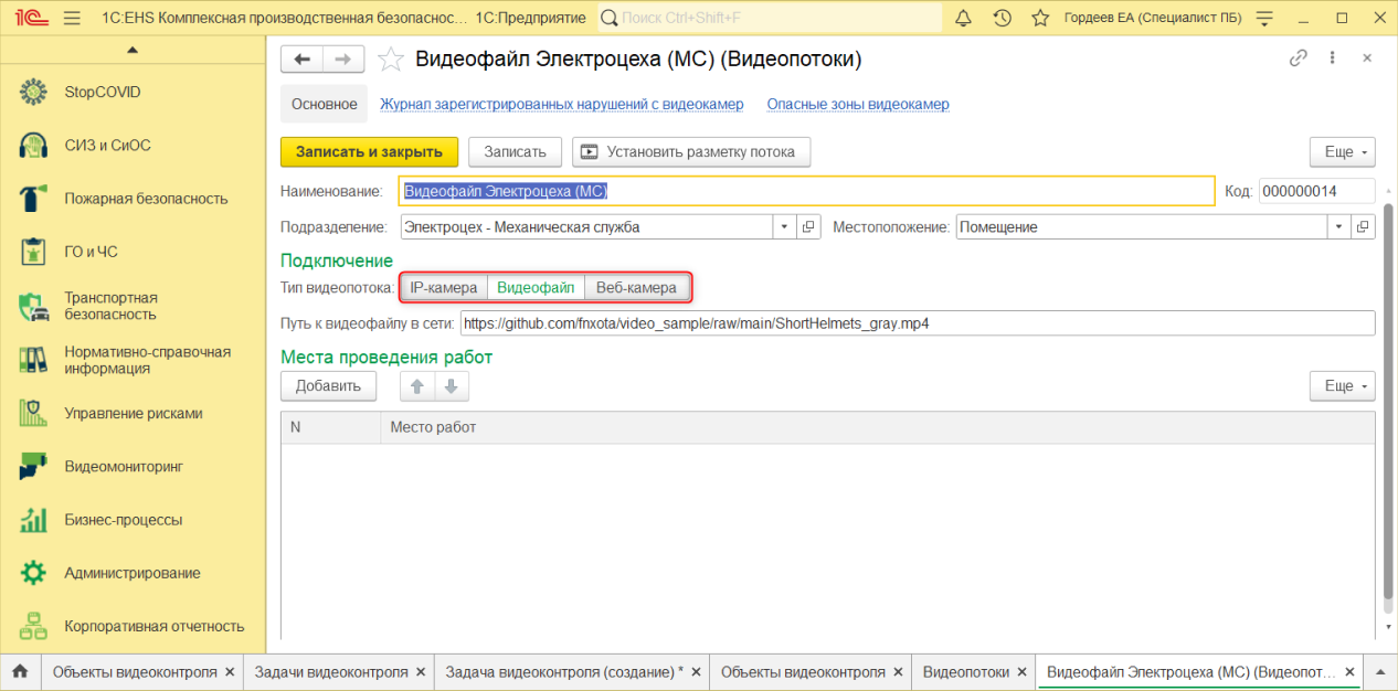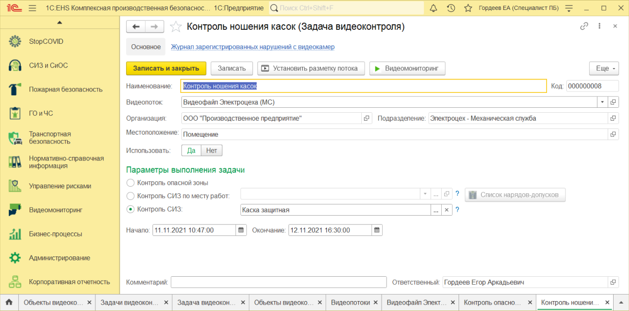 Определяет задачи для системы видеоконтроля (например, контроль наличия СИЗ на работниках при осуществлении работ, по конкретному месту выполнения работ, контроль нахождения в опасной зоне) (рис.3).