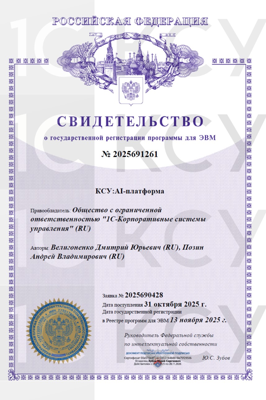 Компания «1С-Корпоративные системы управления» получила Свидетельство Роспатента на новый программный продукт «КСУ:AI-платформа». Решение позволяет компаниям быстро создавать AI-ассистентов, которые работают с корпоративными данными и дают точные ответы на основе внутренней документации.